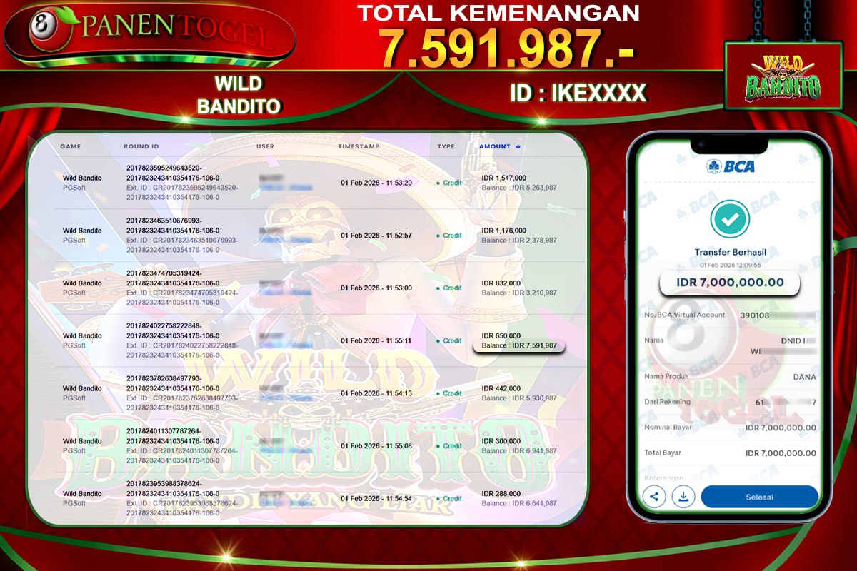 Selamat Kepada User ID : IKE**** Member PANENTOGEL JACKPOT WILD BANDITO