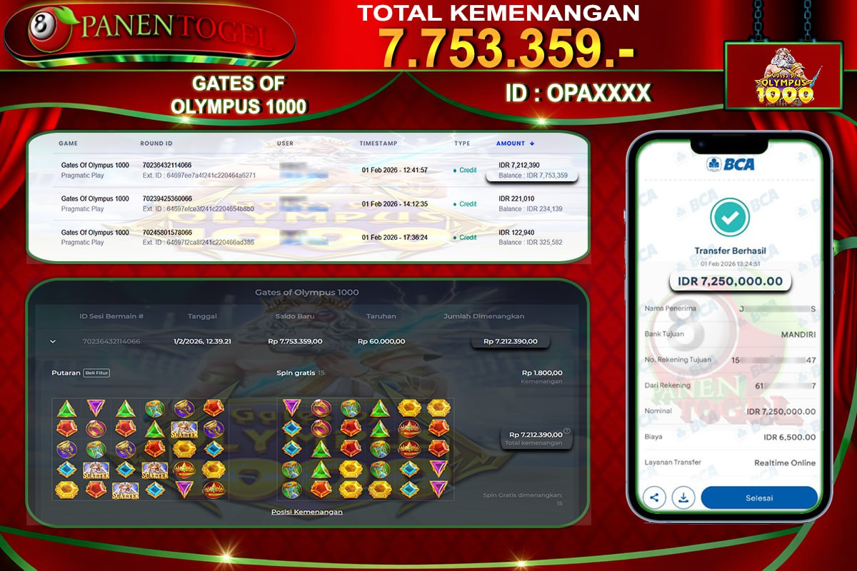 Selamat Kepada User ID : OPA**** Member PANENTOGEL JACKPOT GATE OF OLYMPUS 1000
