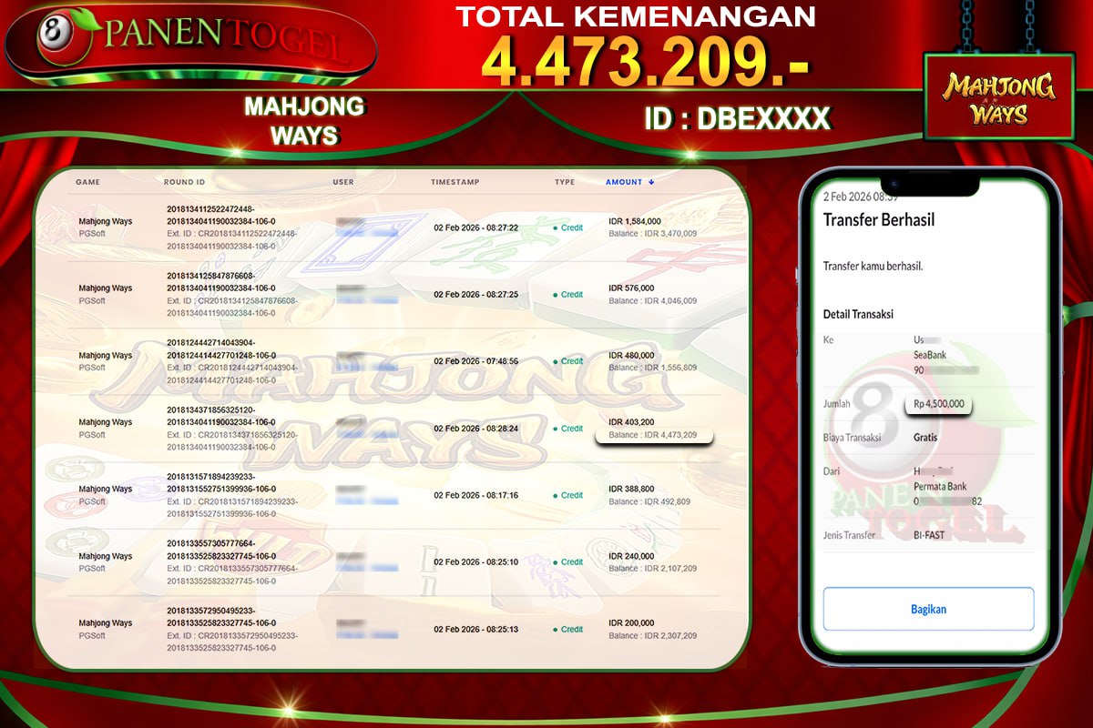 Selamat Kepada User ID : DBE**** Member PANENTOGEL JACKPOT MAHJONG WAYS 2