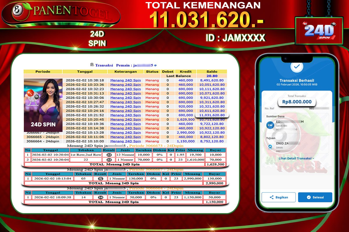 BUKTI KEMENANGAN LIVE GAME 24D SPIN PANENTOGEL Rp. 11.031.620, - LUNAS