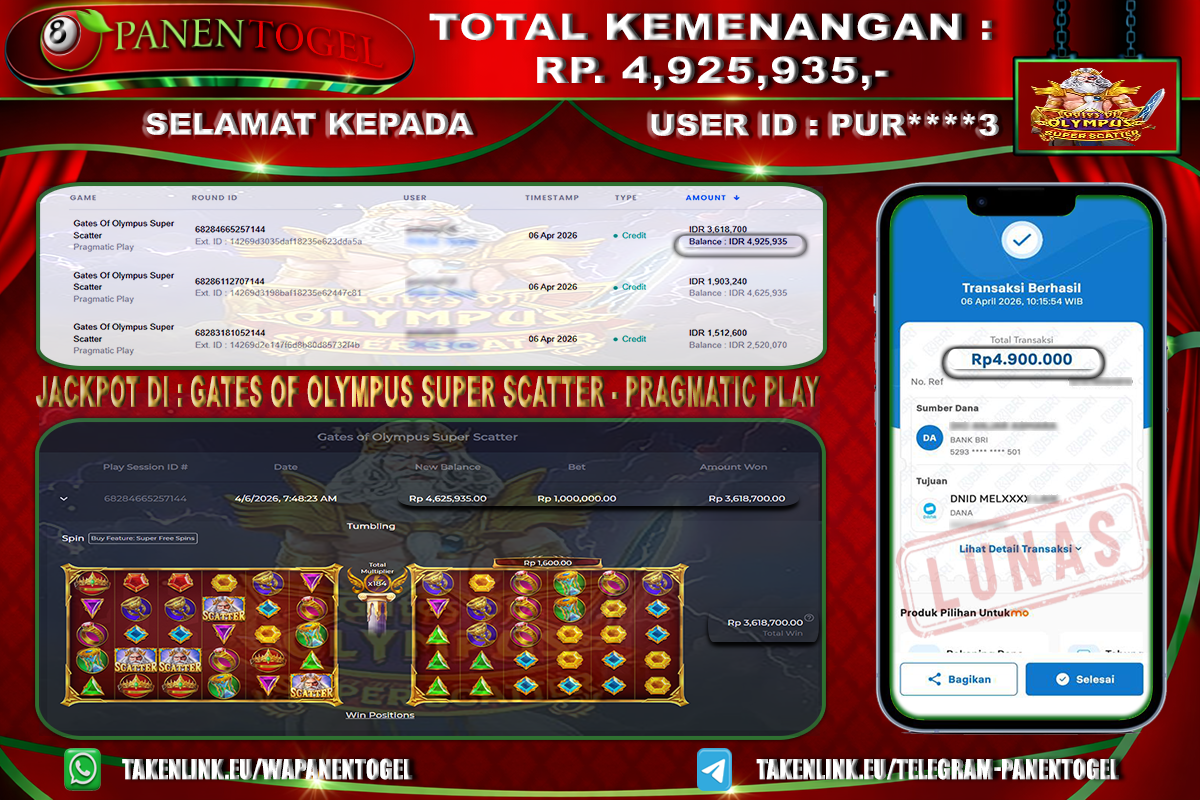 Selamat Kepada User ID : AV**** Member PANENTOGEL JACKPOT MANIA OLYMPUS