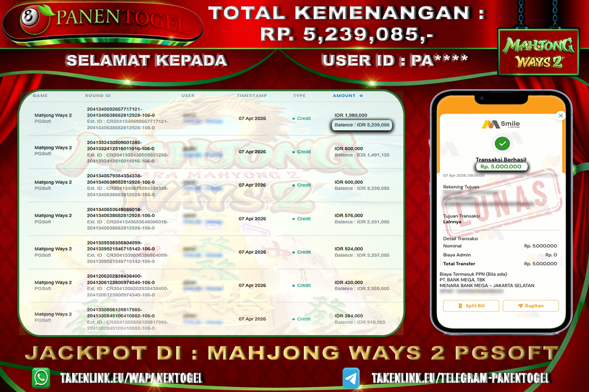 Selamat Kepada User ID : PA**** Member PANENTOGEL JACKPOT MAHJONG WAYS 2