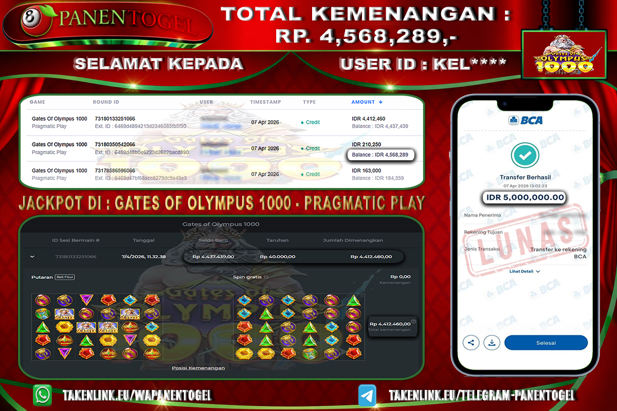 Selamat Kepada User ID : KEL**** Member PANENTOGEL JACKPOT GATES OF OLYMPUS 1000
