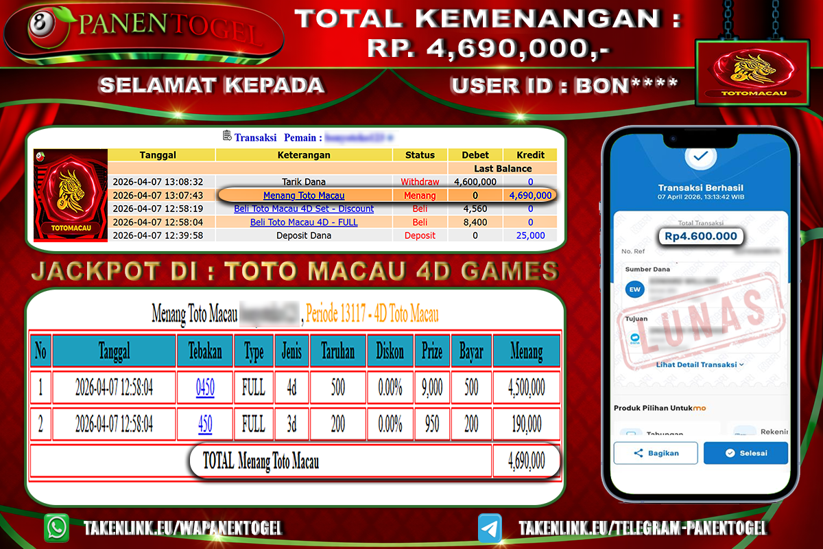 BUKTI KEMENANGAN TOGEL TOTO MACAU 4D GAMES PANENTOGEL Rp. 4.690.000, - LUNAS
